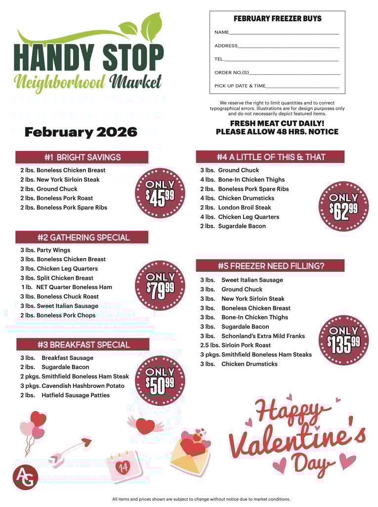 Our meat department started at Handy Stop in 2020 just covering the basics. Now with our team growing, we are able to do meat packages, special holiday orders and requests, fresh sliced deli meats and more. If you have any questions, please call to speak with someone from the meat department or click the link below to view our monthly meat package flier!