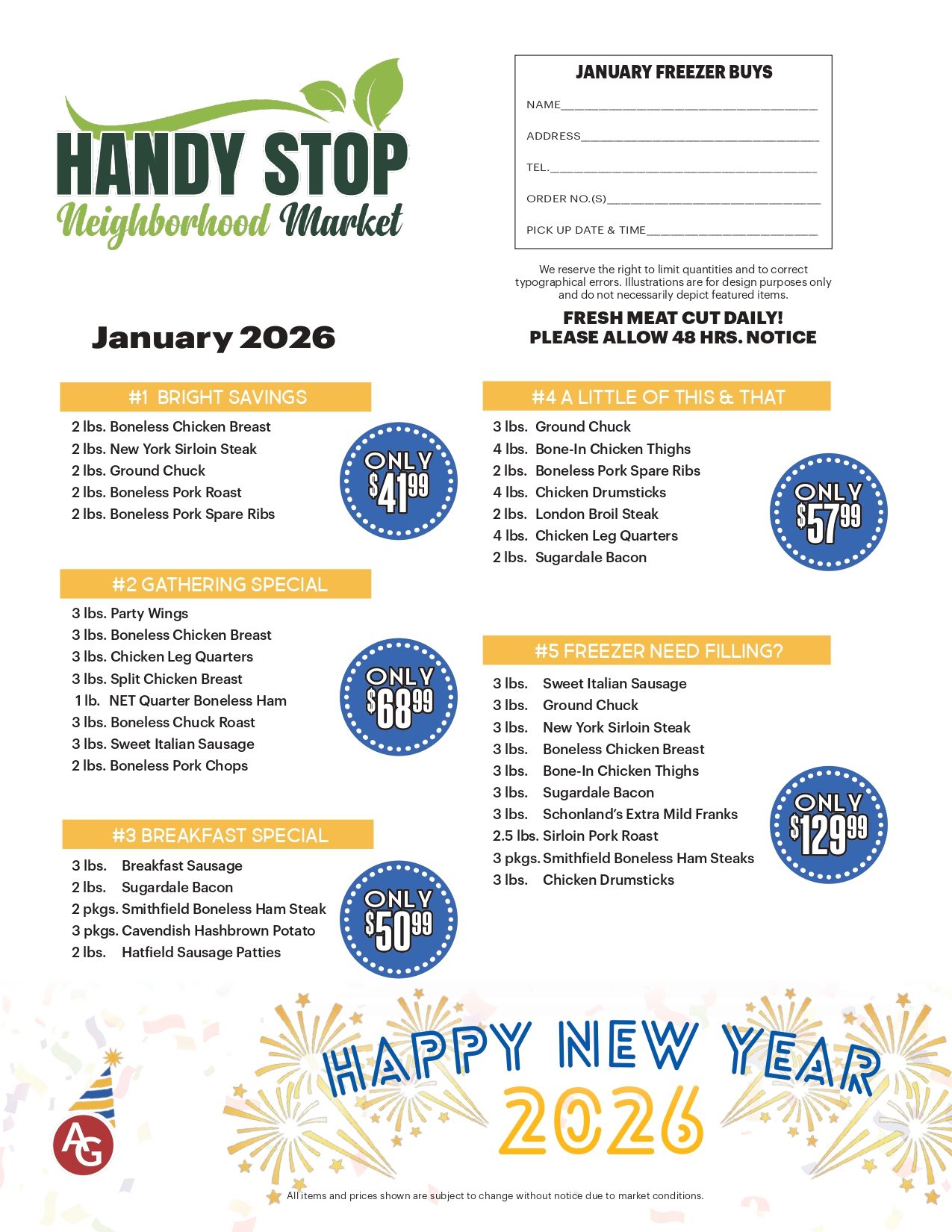 Our meat department started at Handy Stop in 2020 just covering the basics. Now with our team growing, we are able to do meat packages, special holiday orders and requests, fresh sliced deli meats and more. If you have any questions, please call to speak with someone from the meat department or click the link below to view our monthly meat package flier!
