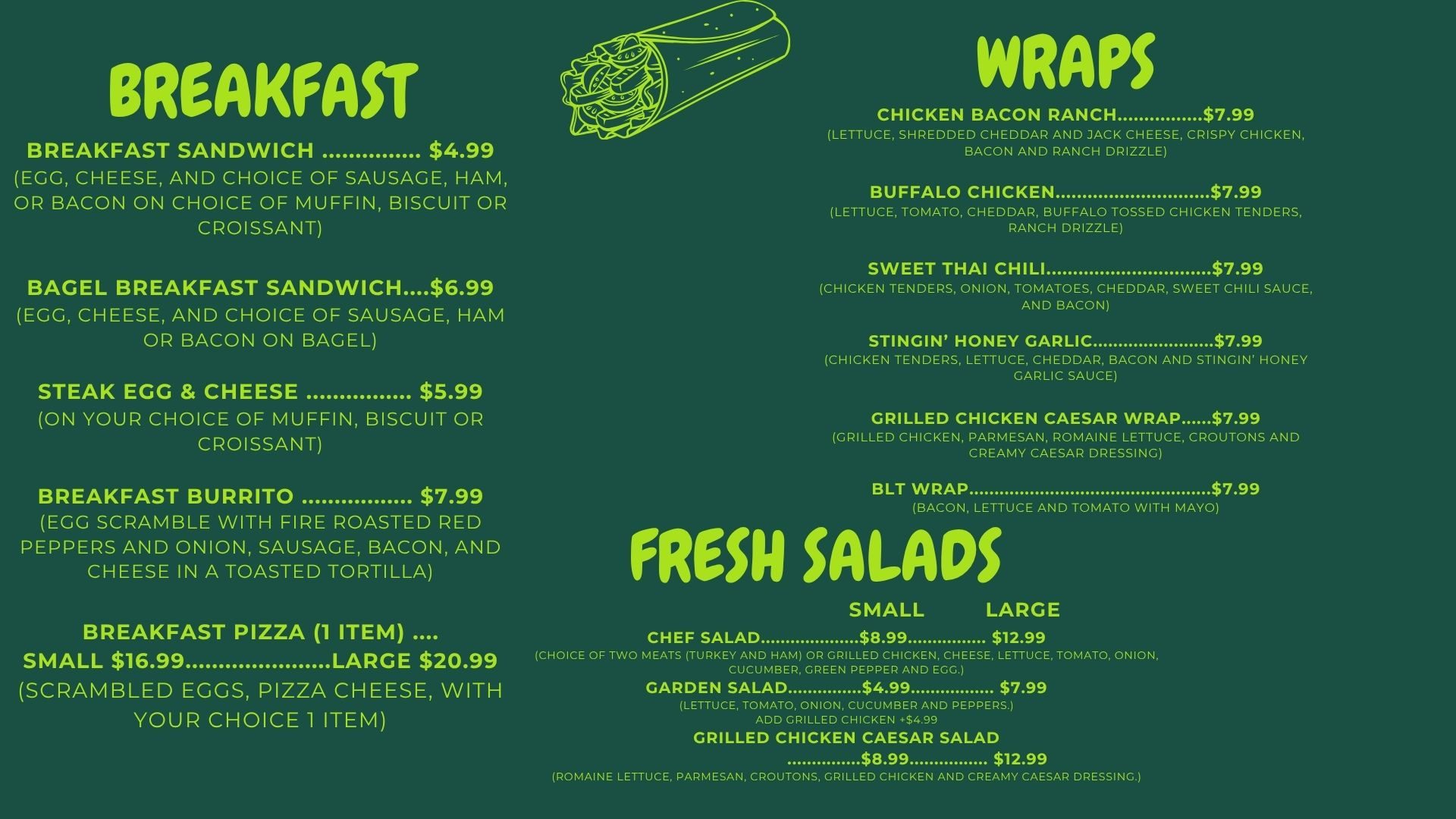 Our Lee location offers a large variety of breakfast, lunch and dinner options! Stop in for a creative Grab n Go selection with new specials everyday or call us to order a fresh dough pizza. Click on the link to see our full menu or call and talk with one of our staff members to see what we can accommodate!